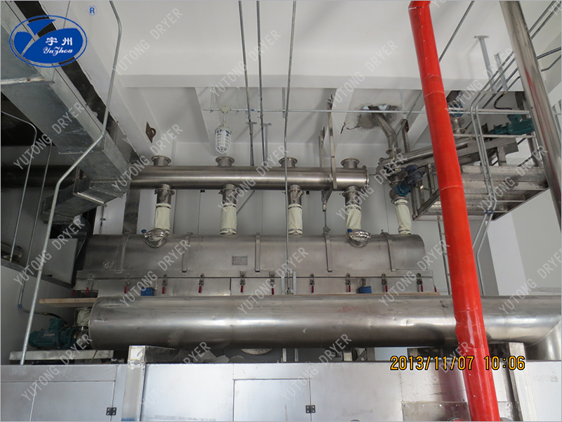 The material enters the machine from the feed port. Under the action of vibration force, the material is thrown in the horizontal direction and continuously moves forward. After the hot air passes upward through the fluidized bed to exchange heat with the wet material, the wet air is discharged by the exhaust vent after the dust removal by the cyclone separator, and the dry material is discharged by the discharge port.