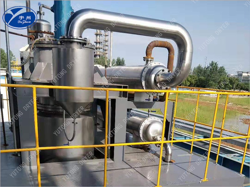 The material enters the evaporator radially from the top of the heating area, and is distributed to the heating wall of the evaporator through the distributor. Then the rotating film scraper squeezes the material into a liquid film of uniform thickness on the heating surface continuously and uniformly, and pushes it downward in a spiral shape. In this process, the rotating film scraper ensures that the continuous and uniform liquid film produces high-speed turbulence, and prevents the liquid film from coking and scaling on the heating surface, thereby improving the total transfer coefficient. The light components are evaporated to form a steam flow, which reaches the external condenser directly connected with the evaporator through the vapor-liquid separator, and the recombination is discharged from the cone at the bottom of the evaporator. A unique distributor not only has the ability to evenly flow the material to the inner wall of the evaporator to prevent the material from splashing into the steam stream inside the evaporator, but also has the ability to prevent the newly entered material from flashing here, which is conducive to the elimination of foam, and the material can only evaporate along the heating surface. The upper part of the scraper evaporator is equipped with a centrifugal separator designed according to the characteristics of the material, which separates the droplets from the rising steam stream and returns them to the distributor.