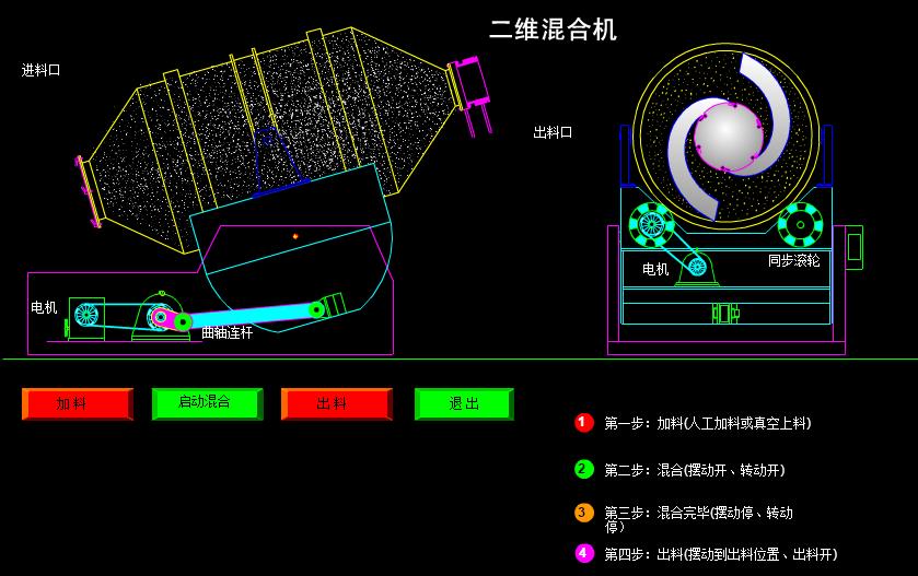 The two-dimensional mixer is mainly composed of three parts: a rotary drum, a swing frame, and a frame. The drum is mounted on a swing frame, supported by four rollers and axially positioned by two gear wheels. Among the four supporting rollers, two transmission wheels are driven by a rotating power system to rotate the drum. The swing frame is driven by a set of crank swing rod mechanisms, which are mounted on the frame. The swing frame is supported on the frame by bearing components.