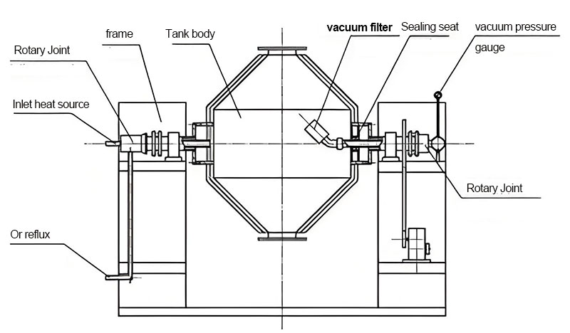 2、Under the power drive, the tank is rotated slowly, and the materials in the tank are continuously turned over, so as to achieve the purpose of strengthening the drying.