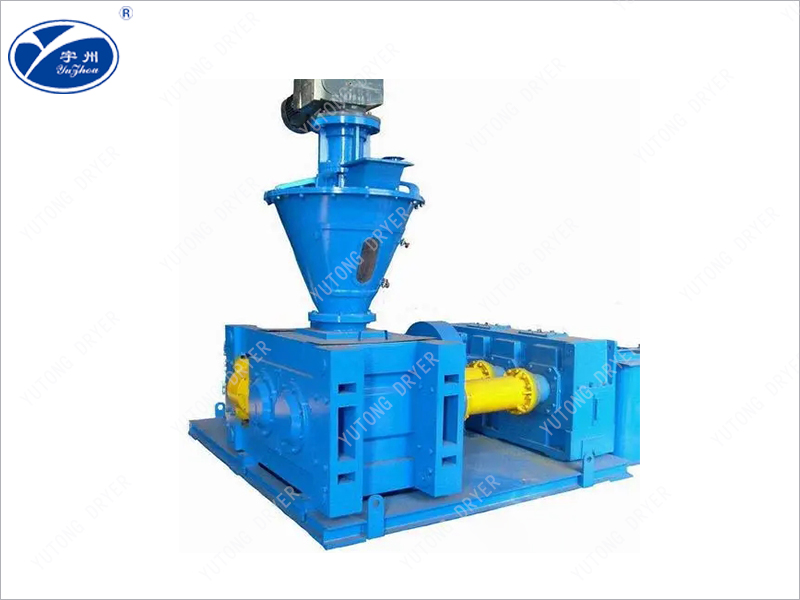 Various dry powder materials are added from the top of the equipment, and after degassing and spiral preloading, they enter two equal rolling rolls. The rolling rolls rotate relative to each other, and the materials are forced into the gap between the two rolls. The grooved rolling rolls bite the materials into the gap and are forced to compress them. After passing through the compression zone, the surface tension and weight of the materials naturally release them. The detached finger shaped agglomerates enter the crusher and are crushed by a rotating blade. The crushed material enters the granulator and is sieved by a rotary vibrating screen through a rolling blade. Qualified products are transported to the finished product warehouse through a conveyor. The powdered screened material is sent back to the raw material warehouse for secondary rolling through a conveyor, and the squeezing force can be adjusted by the pressure of the hydraulic cylinder according to the needs of the granulation operation. By changing the groove form of the roller surface, sheet, strip, and flattened spherical materials can be obtained.