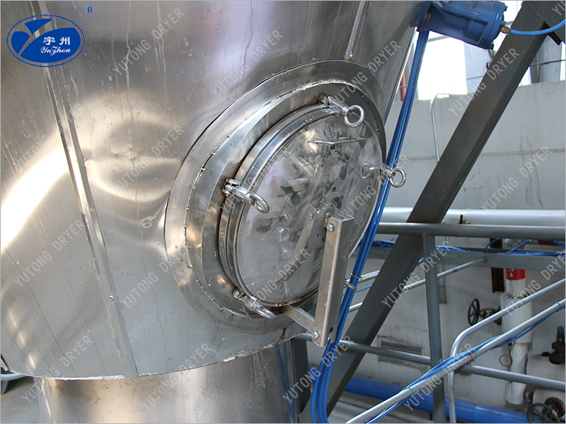 本機組工作過程為料液通過隔膜泵高壓輸入,噴出霧狀液滴,然后同熱空氣并流下降,大部分粉粒由塔底排料口收集,廢氣及其微小粉末經(jīng)旋風(fēng)分離器分離,廢氣由抽風(fēng)機排出,粉末由設(shè)在旋風(fēng)分離器下端的授粉筒收集,風(fēng)機出口還可裝備二級除塵裝置,回收率在96-98%以上。