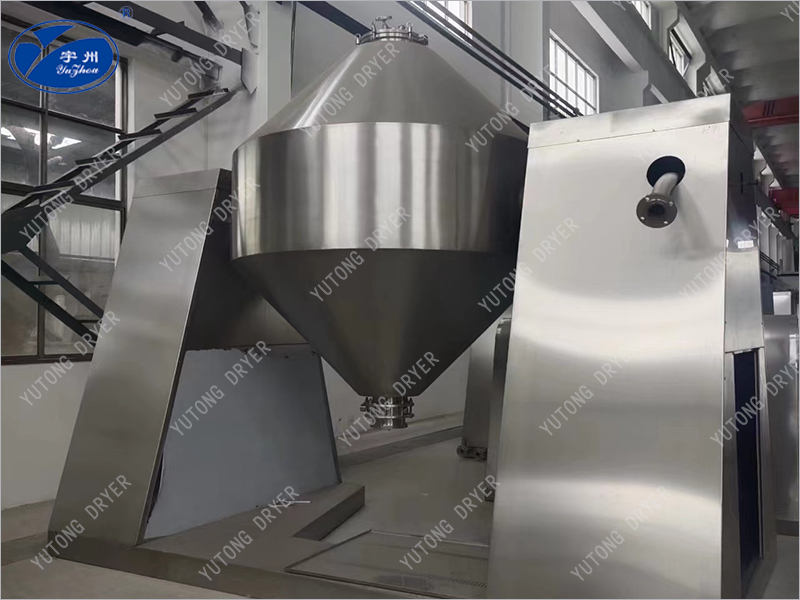 SZG系列雙錐回轉真空干燥機為雙錐形的回轉罐體,罐體在真空狀態下,向夾套內通入導熱油或熱水進行加熱,熱量通過罐體內壁與濕物料接觸。濕物料吸熱后蒸發的水汽或其他氣體,通過真空泵經真空排氣管被抽走。由于罐體內處于真空狀態,且罐體的回轉使物料不斷的上下,內外翻動,故加快了物料的干燥速度,提高干燥速率,達到均勻干燥的目的。
