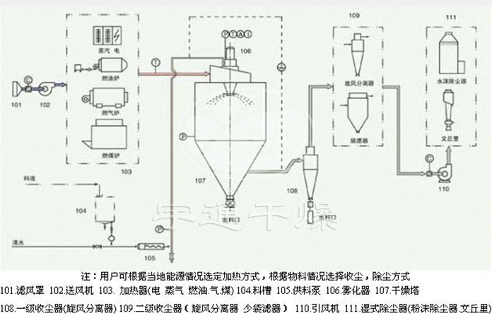 1、熱氣流與霧滴的接觸:有足夠量的熱氣流進(jìn)入噴霧干燥室時,必須考慮熱氣流的方向及角度,無論是并流、逆流還是混流,確保與霧滴的充分接觸,才能進(jìn)行充分的熱交換。