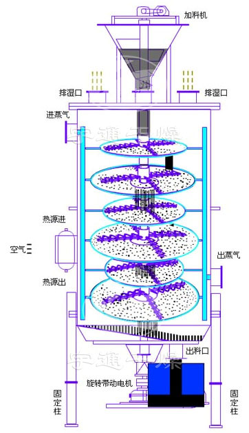 濕物料自加料器連續地加到干燥器上部一層干燥盤上,帶有耙葉的耙臂作回轉運動使耙葉連續地翻抄物料。物料沿指數螺旋線渡過干燥盤表面,在小干燥盤上的物料被移送到外緣,并在外緣落到下方的大干燥盤外緣,在大干燥塔上物料向里移動并從中間落料口落入下一層小干燥盤中。大小干燥盤上下交替排列,物料得以連續地流過整個干燥器。中空的干燥盤內通入加熱介質,加熱介質形式有飽和蒸汽、熱水和導熱油,加熱介質由干燥盤的一端進入,從另一端導出。已干物料從Z后一層干燥盤落到殼體的底層,Z后被耙葉移送到出料口排出。濕份從物料中逸出。由設在頂蓋上的排濕口排出,真空型盤式干燥器的濕氣由設在頂蓋上的排濕口抽出。從底層排出的干物料可直接包裝。通過配加翅片加熱器、溶劑回收冷凝器、袋式除塵器、引風機等輔機,可提高其干燥的生產能力,熱敏性物料,可方便地回收溶劑,并能進行熱解和反應操作。