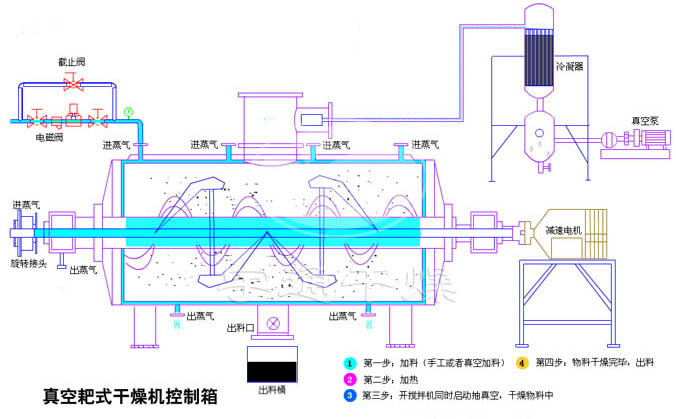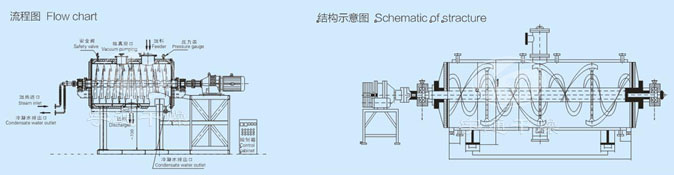 本機是一種新型臥式間歇式真空干燥設備,濕物料經傳導蒸發,帶有刮板攪拌器不斷清除內壁上的物料,并在容器內推移形成循環流,水份蒸發后由真空泵抽出。
