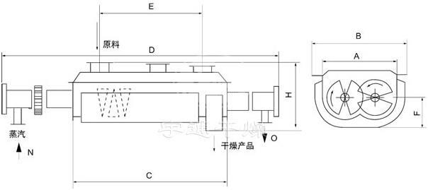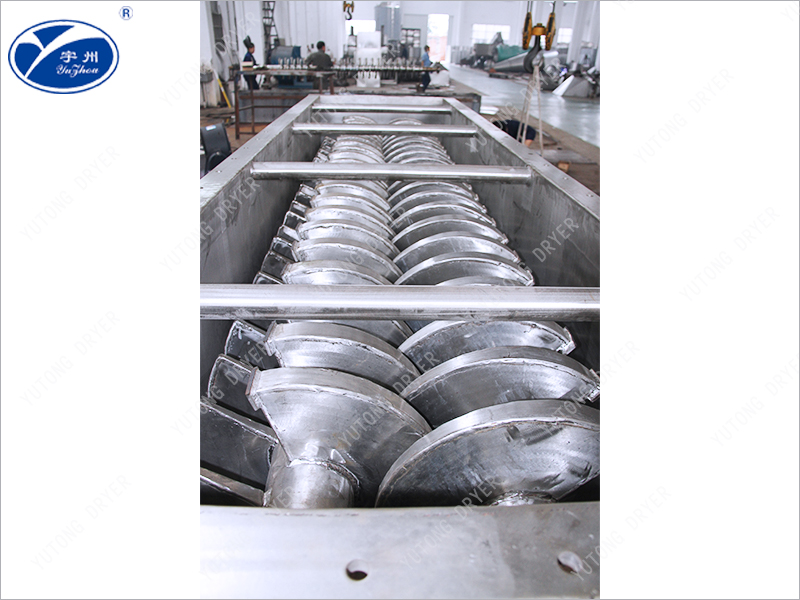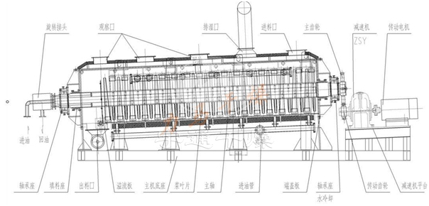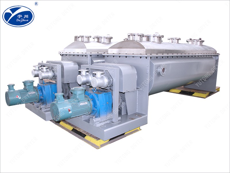 空心軸上密集排列著楔型中空漿葉,熱介質經空心軸流經漿葉。單位有效容積內傳熱面積很大,熱介質溫度從-40℃到320℃,可以是水蒸汽,也可以是液體型:如熱水、導熱油等。間接傳導加熱,沒有攜帶空氣帶走熱量,熱量均用來加熱物料。熱量損失僅為通過器體保溫層向環境的散熱。楔型漿葉傳熱面具有自清潔功能。物料顆粒與楔型面的相對運動產生洗刷作用,能夠洗刷掉楔型面上附著物料,使運轉中一直保持著清潔的傳熱面。漿葉干燥機的殼體為Ω型,殼體內一般安排二到四根空心攪拌軸。殼體有密封端蓋與上蓋,防止物料粉塵外泄而充分發揮作用。