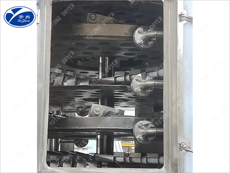 Влажный материал непрерывно добавляется питателем в первый слой сухого диска в верхней части сушилки, а скреперный рычаг вращается, чтобы непрерывно переворачивать материал. Материал проходит по экспоненциальной спирали через поверхность сухого диска, а материал на маленьком диске переносится на внешний край, где он падает на внешний край большого диска ниже. Материал перемещается изнутри на большой сушильной башне, из промежуточного выхода попадает в следующий слой маленького сухого диска. Сухие пластины разных размеров чередуются вверх и вниз, так что материал непрерывно течет через всю сушилку. Полые сухие поддоны содержат нагревательную среду, которая включает насыщенный пар, горячую воду и горячее масло. Тепловая среда входит с одного конца сухого лотка и уходит с другого. Высушенный материал падает с нижнего сухого поддона на нижнюю часть корпуса, а затем скрепляется в выпускное отверстие для сброса. Вода выходит из материала. Вода из вакуумной дисковой сушилки выделяется через выхлопное отверстие на крышке, а вода извлекается из вакуумного насоса на крышке. Сухие материалы, выходящие из нижнего слоя, могут быть упакованы непосредственно. Производственная мощность сушки может быть улучшена за счет добавления вспомогательного оборудования, такого как радиаторы, конденсаторы для рекуперации растворителей, мешковые пылеуловители, сухие смесительные конструкции и вентиляторы. Сухие пастообразные и термочувствительные материалы могут быть легко переработаны из растворителей и могут быть подвергнуты пиролизу и реакциям.